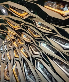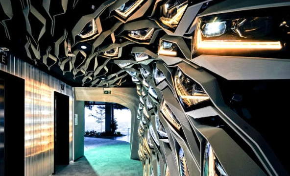 △斯柯達總部這面3D打印墻面,是由50個速派的前大燈組成,并且呈現(xiàn)一個弧形